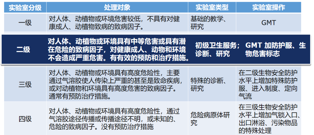 根据危险度等级,包括传染病原的传染性和危害性,国际上将生物实验室按照生物安全水平(Biosafety level,BSL)分为P1(Protection level 1),P2,P3和P4四个等级。