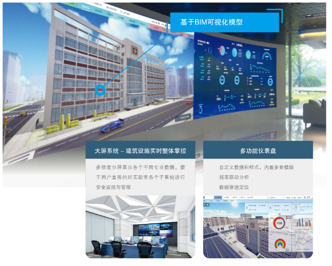 运用先进的物联网传感技术和大数据分析、对实验室建筑及各专业设施做全面数据整合、同步和关联,针对实验室专用工作环境建立最大程度整体安全防护和智能管理。